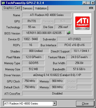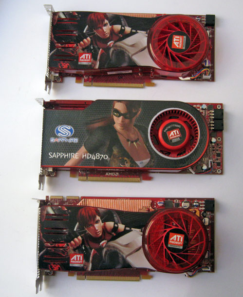 ATI's RV770XT, the chip behind Radeon HD 4870, works at 750MHz and needs a dual slot cooler, while the GDDR5 memory works at 900MHz, which is much faster than GDDR3 memory that is clocked higher. The memory bus is 256-bit wide and this is the same compared as on the old RV670 chip. The RV770XT and PRO are the same chips, but ATI clocks the better yielded chips to 750MHz, calls them XT and matches them with GDDR5, while the slower chips end up with GDDR3.