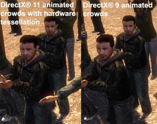 Figure 2: DirectX 11 animated crowds with hardware tessellation enabled (left) and DirectX 9 animated crowds without hardware tessellation (right).